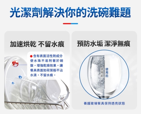 亮碟光潔劑含有表面活性劑的溫和配方,能幫助清除水垢、水漬、水痕問題,維持餐具的潔淨光亮。
